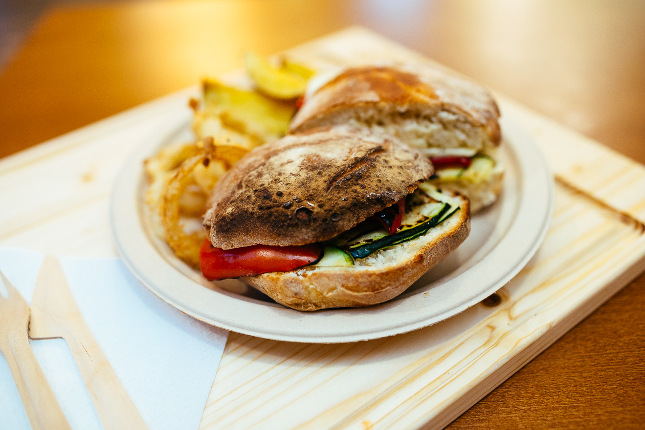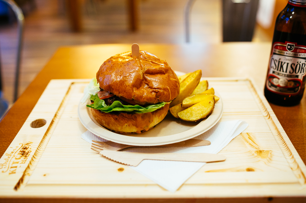 Noi am mâncat, cu poftă, sandviș cu legume la grătar cu cartofi steak cu coajă + rondele de ceapă crocante și burger clasic tot cu cartofi steak cu coajă care a fost acompaniat de o bere Csiki Sor. Ne-au plăcut și ne-au săturat. Acea chiflă…și acei cartofi…yam, yam!