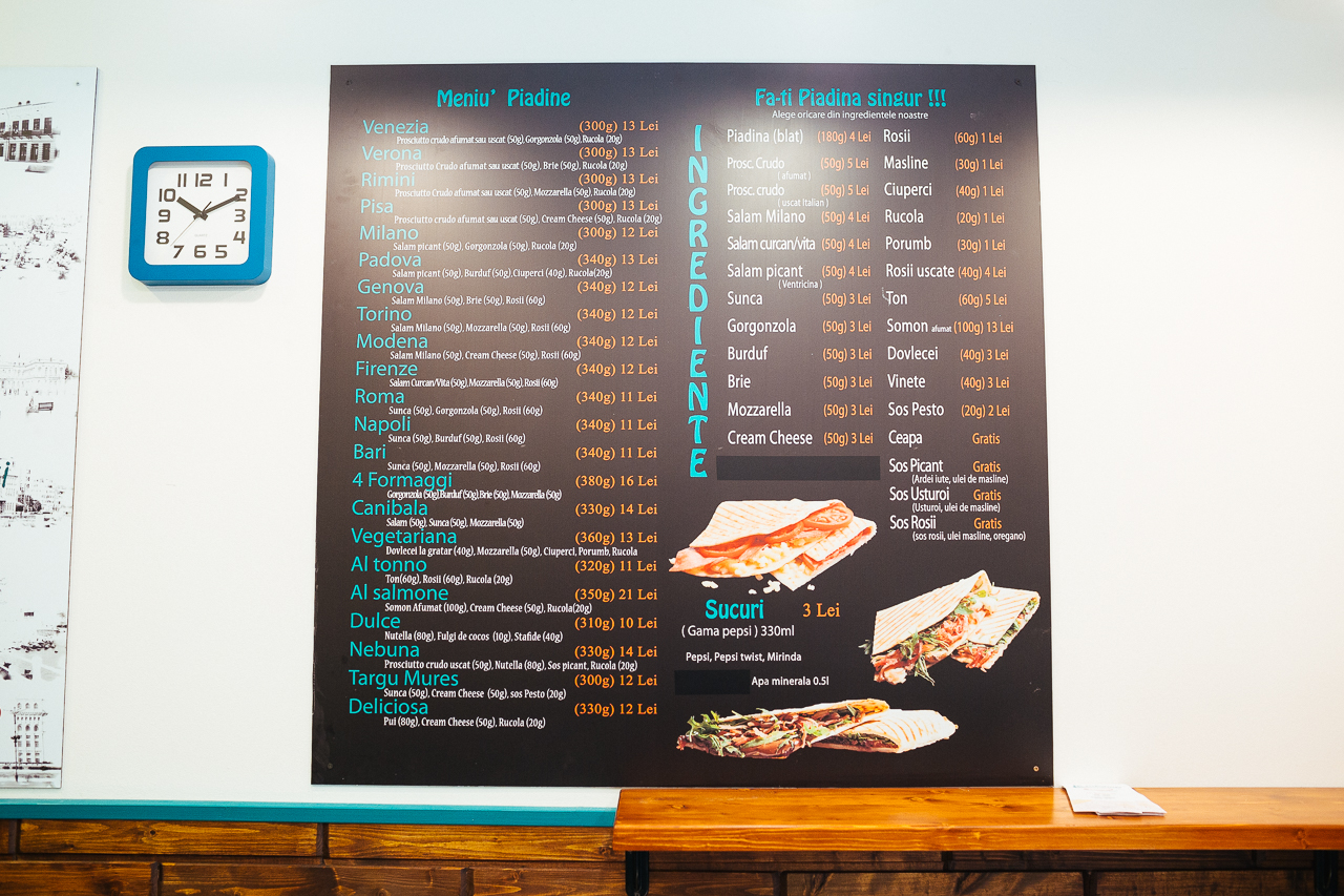Situat pe strada Bolyai la nr. 3/15, chiar lângă Mini, La Piadina își așteaptă clienții cu 22 sortimente de piadine dar și cu varianta de “Fă-ți piadina singur”.