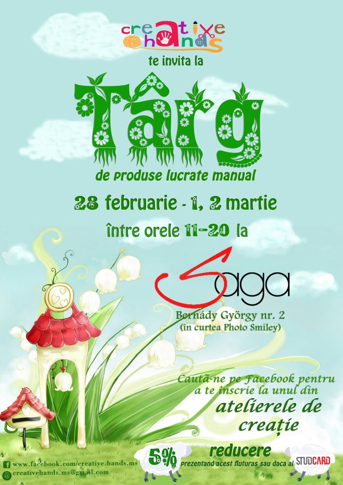 Saga ne-a obişnuit cu evenimente de toate felurile, de la Cvartetul Bohemia (care cântă din douâ în două săptămâni, miercurea)), la stand-up sau târguri handmade. Şi că tot am adus vorba, joi, vineri şi sâmbătă (respectiv din 28.02 în 02.03), echipa Creative Hands (care a mai fost şi prin J’ai şi chiar la Peninsula, dacă nu mă înşel) vă aşteaptă de la orele 11 la 20 în toate cele trei zile cu mărţişoare handmade şi nu numai – “am mai facut cu mânuţele noastre bijuterii, accesorii, jucării, săpunuri naturale, obiecte de decor şi multe alte chestiuţe care să-ţi coloreze lumea”. Iar cei cu Studcard, bineînţeles, beneficiază de reduceri…